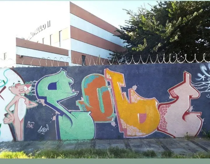 Na relação com o espaço, o grafismo ocupa a extensão do muro de forma equilibrada, explorando a horizontalidade e se apoiando no fundo escuro para destacar as cores quentes e frias. A presença da Pantera Cor-de-Rosa no extremo esquerdo acrescenta um elemento lúdico e culturalmente reconhecível, funcionando como contraponto figurativo ao predomínio tipográfico. O muro, situado em frente a uma instituição escolar, amplia o impacto da intervenção, projetando o graffiti como marca identitária em um espaço de circulação diária de estudantes.