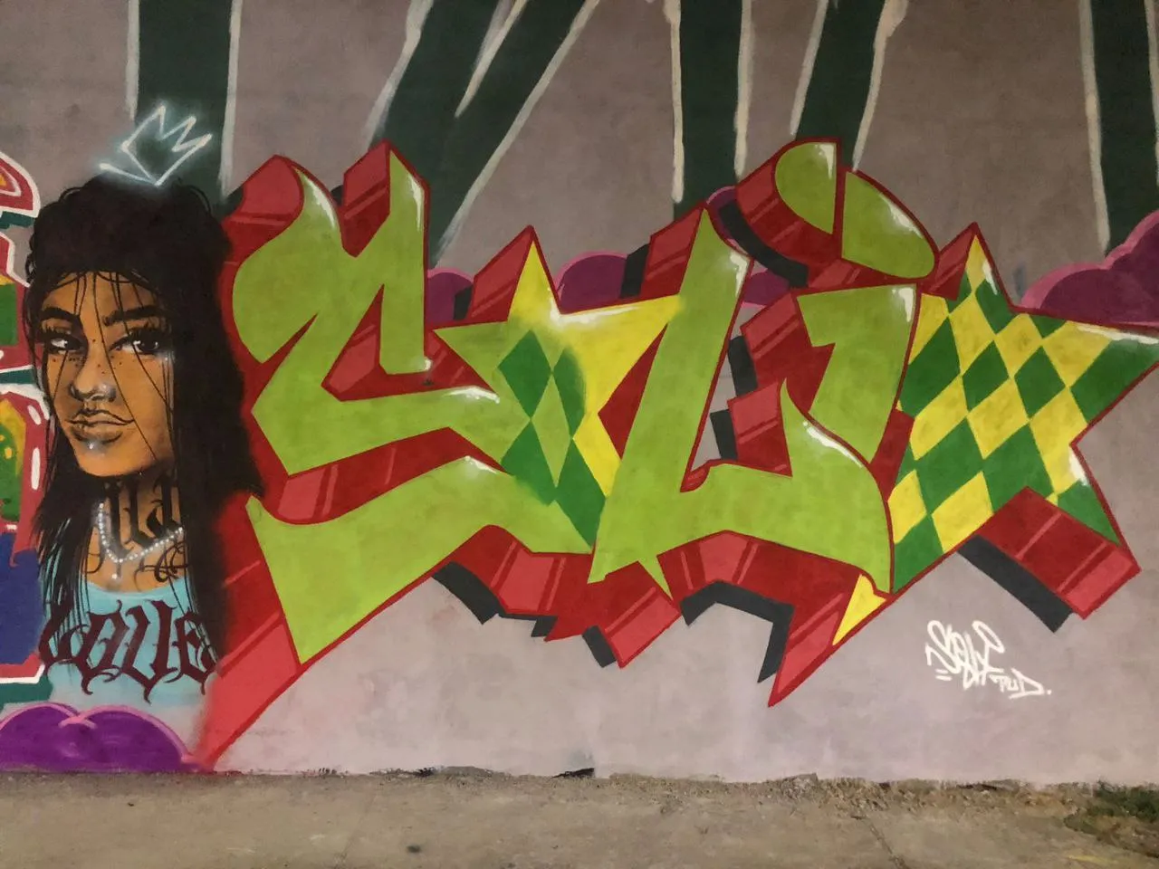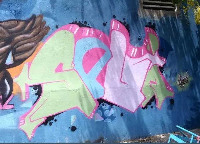 A peça apresenta um lettering com forte caráter experimental, explorando variações tipográficas que rompem com a linearidade clássica. Cada letra é tratada de maneira distinta, com preenchimentos cromáticos diferenciados — verde, laranja, amarelo e vermelho — sugerindo uma abordagem quase modular. Essa escolha confere diversidade interna, mas também fragmenta a unidade visual, revelando um exercício de estilo e de experimentação formal. O uso de contornos grossos e de áreas chapadas indica domínio do spray, embora algumas zonas apresentem irregularidades que reforçam o caráter processual da obra.