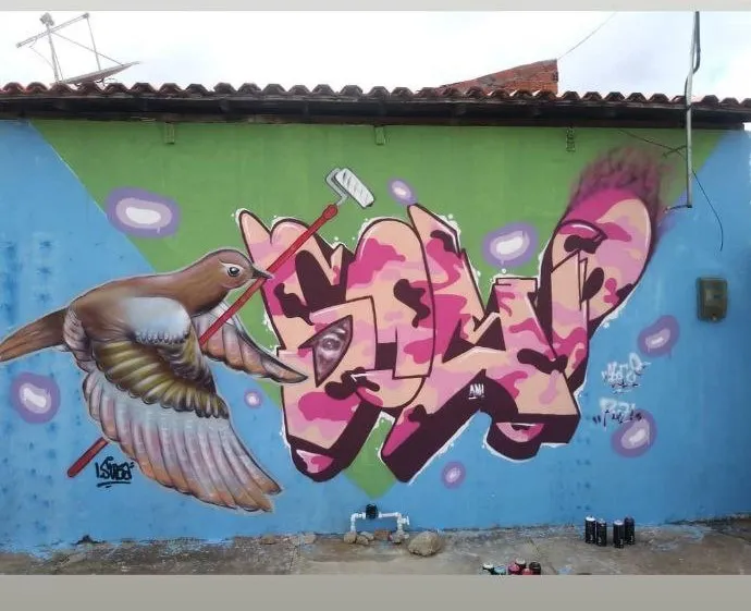 Situada em frente a uma creche, essa peça combina lettering robusto de Soli e a figura de um pássaro, feita por Léo. A obra articula dois elementos distintos: a energia cromática das letras, que se projetam em tons vibrantes, e o desenho figurativo da ave, que confere organicidade ao conjunto. O contexto — uma quadra comunitária — reforça o caráter público e cotidiano da obra. Mais do que estética, ela funciona como marcador simbólico do bairro, visível para crianças e famílias que circulam diariamente.