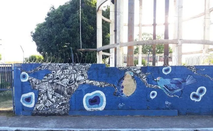 A intervenção no muro, próxima a uma estrutura abandonada, apresenta um diálogo entre colagem gráfica e pintura mural, configurando um trabalho de caráter híbrido. No aspecto técnico, o uso predominante do preto e branco na área da esquerda resulta em um grafismo detalhado, com sobreposição de elementos mecânicos e orgânicos que remetem à linguagem do stencil e da gravura. Esse procedimento, ao acumular imagens em um mesmo plano, cria densidade visual e textura marcada, contrastando com o azul chapado do fundo. Já as figuras de aves, aplicadas em tonalidades frias, revelam domínio de gradação cromática, aproximando-se do realismo, ainda que simplificadas no traço.