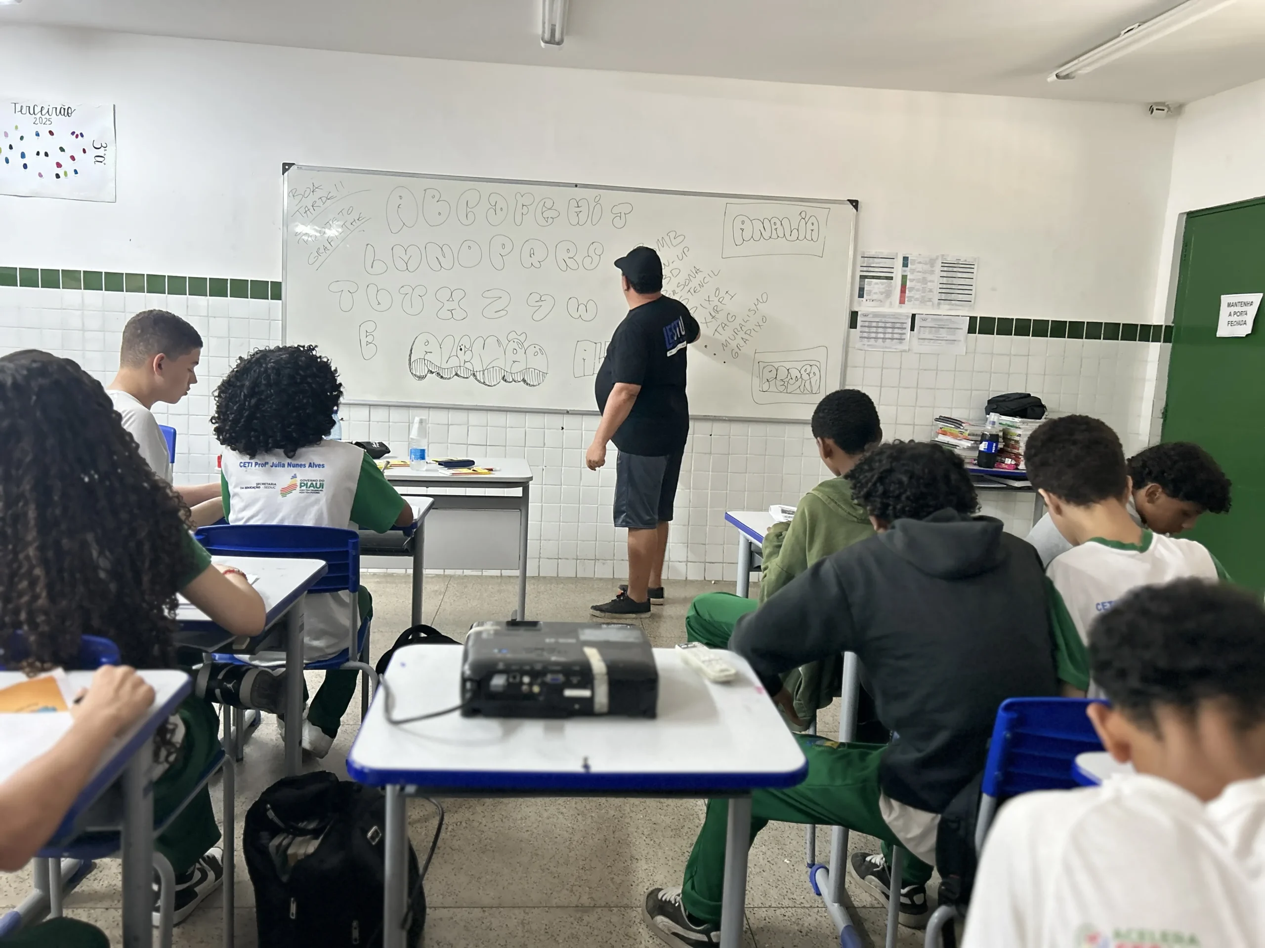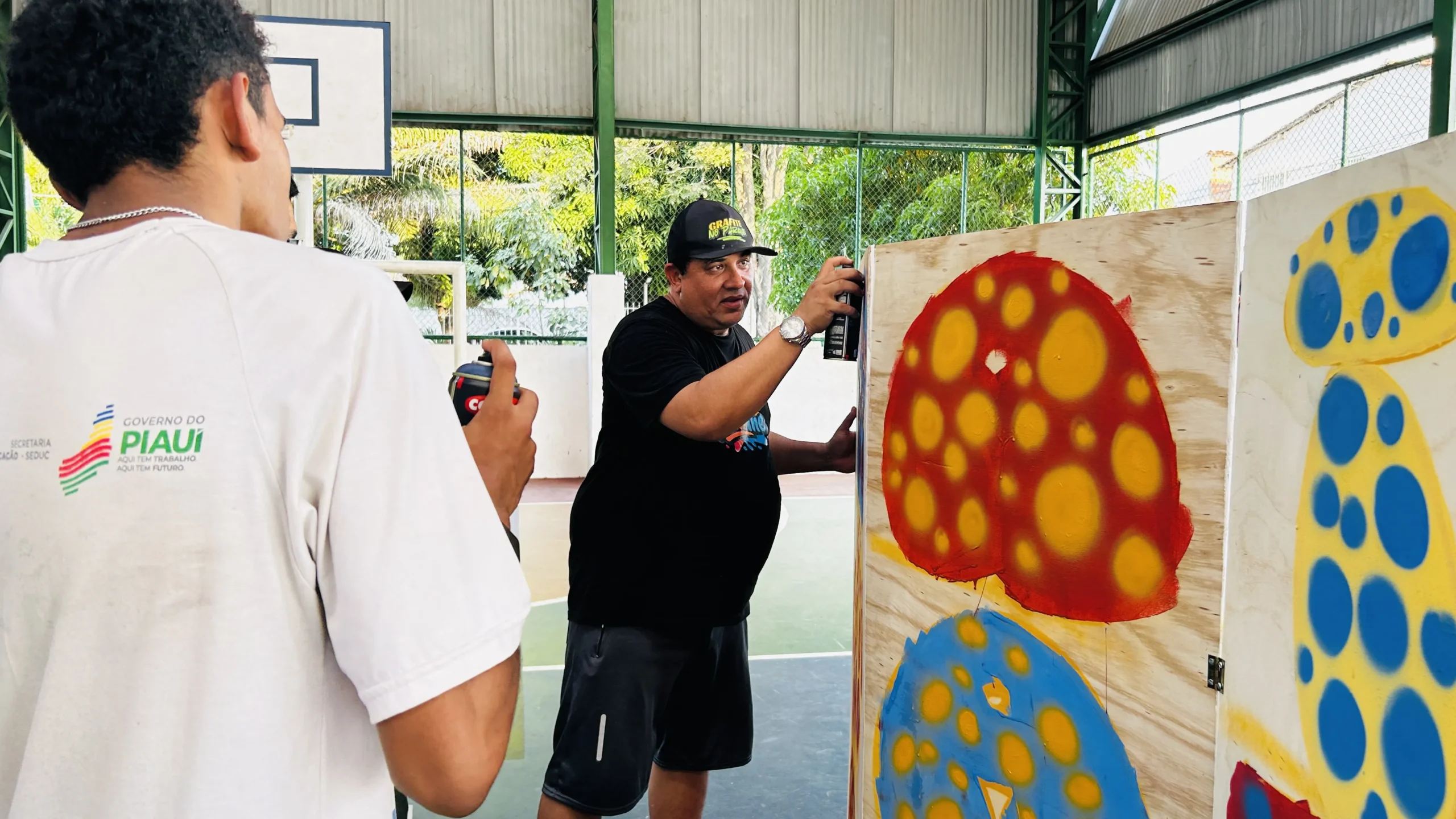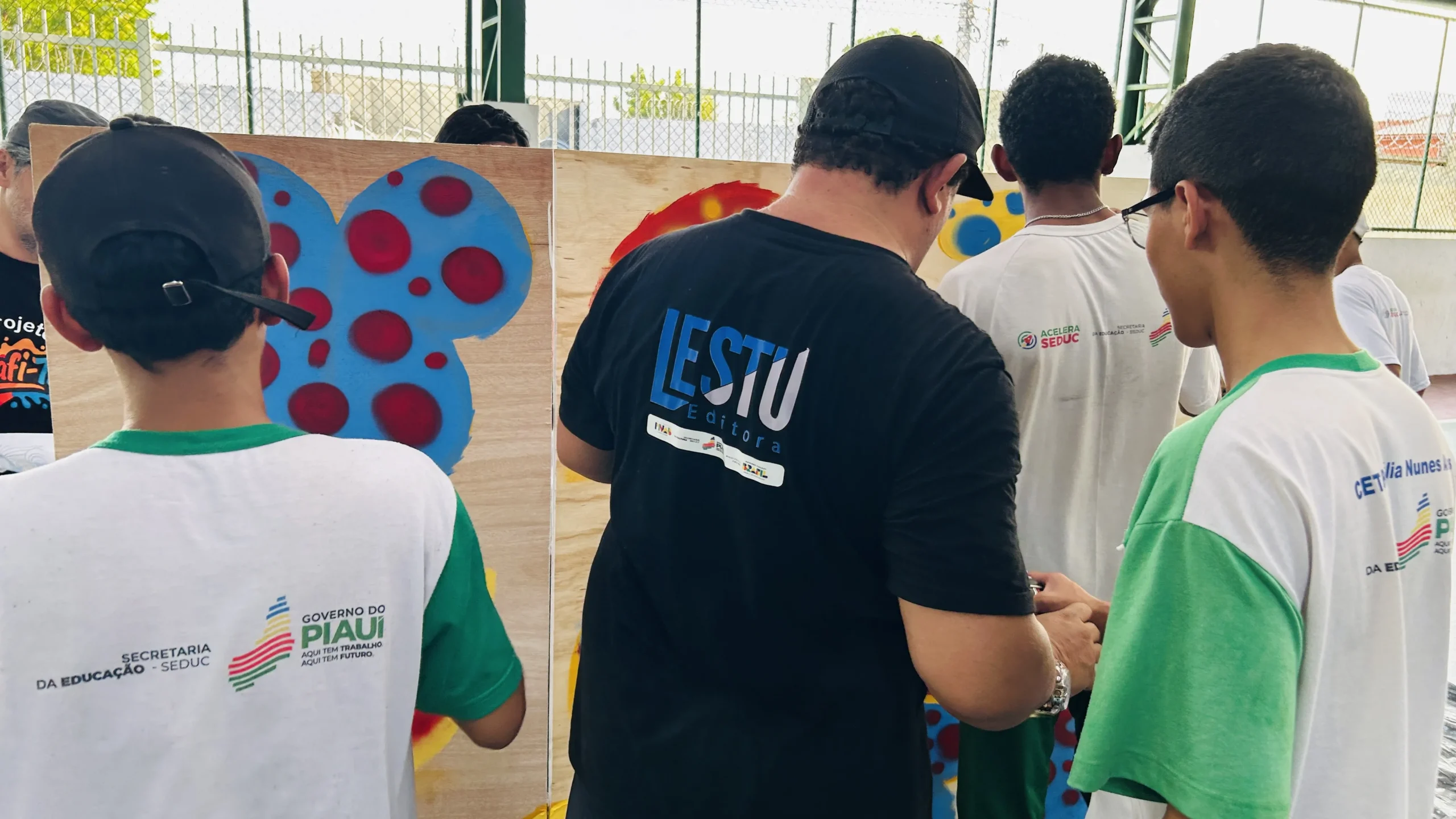 No dia 1º de outubro de 2025, o CETI Júlia Nunes, no bairro Dirceu Arcoverde, recebeu a terceira oficina de graffiti do Projeto Grafi-The — uma iniciativa cultural da Editora Lestu, aprovada pela Política Nacional Aldir Blanc (PNAB 2024). A oficina foi ministrada por Eduardo Alemão, do coletivo VDC (Vai Dar Certo), e pelo artista Saná Costa, ambos atuantes na cena artística piauiense. Realizada das 8h às 17h, a atividade marcou a continuidade do ciclo formativo que vem aproximando estudantes de diferentes regiões de Teresina da arte urbana e de suas dimensões sociais, estéticas e políticas. A proposta central foi incentivar a criação coletiva e a experimentação visual, utilizando o graffiti como ferramenta de expressão e de leitura crítica da realidade local.