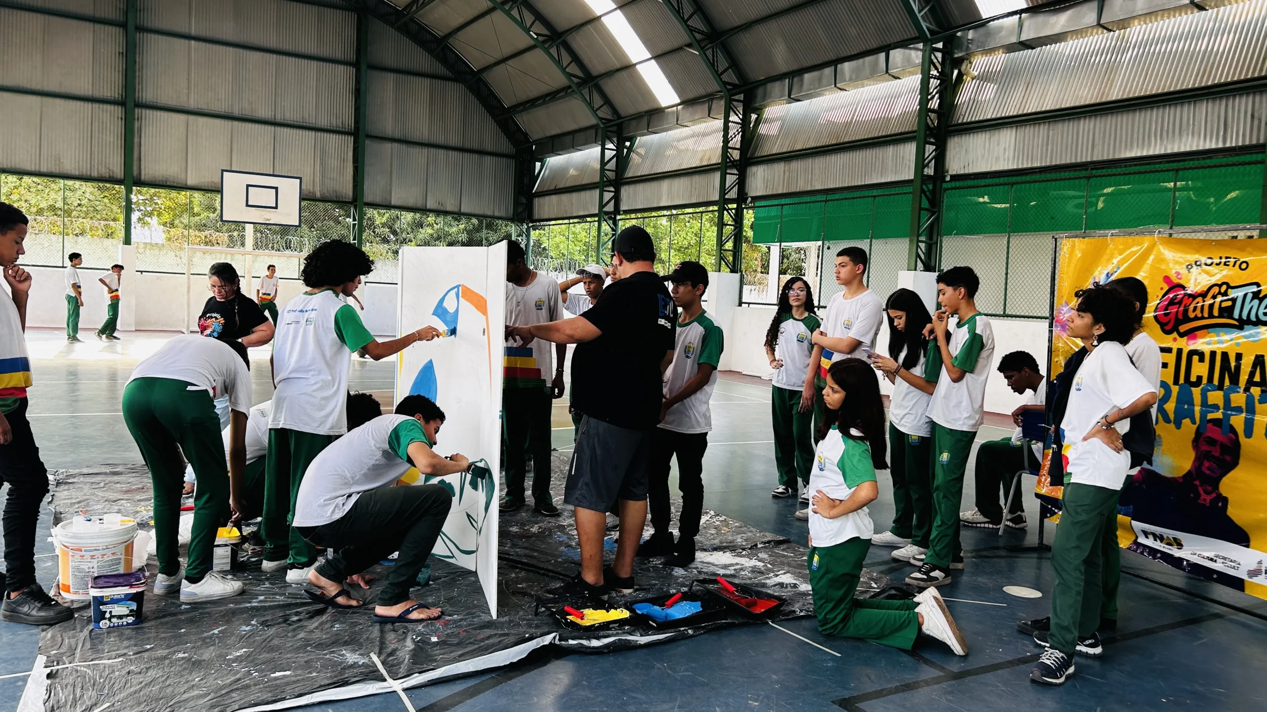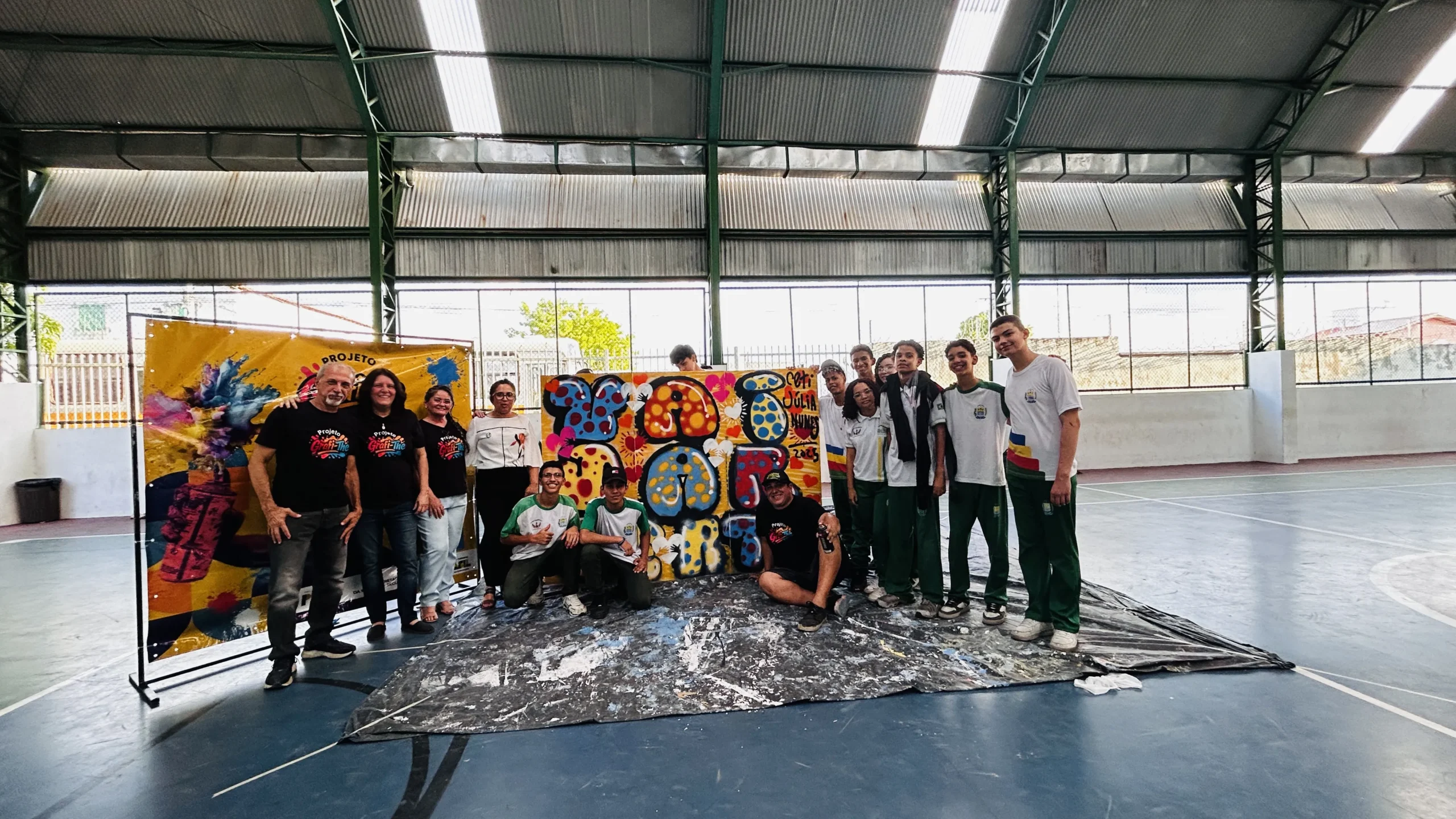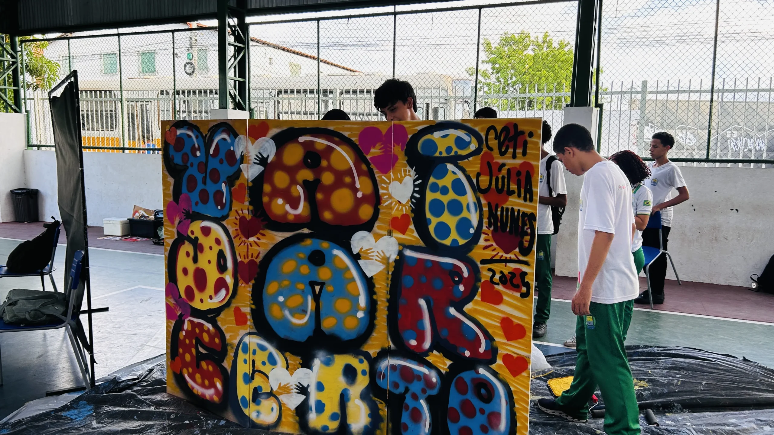 Encerrando a oficina, os alunos produziram um painel coletivo, combinando as técnicas aprendidas com tinta látex, spray e stencil. A proposta final reforçou o valor do graffiti como prática de cidadania e como forma de apropriação simbólica do espaço escolar. Sob a orientação dos instrutores, os jovens compreenderam o muro não apenas como suporte, mas como território de diálogo — uma superfície que comunica e acolhe múltiplas vozes. O resultado reflete o propósito do Projeto Grafi-The: democratizar o acesso à arte urbana e consolidar sua relevância como expressão crítica e cultural. Ao aproximar o graffiti do ambiente escolar, o projeto reafirma a potência criativa das periferias e a capacidade da arte de conectar saberes, territórios e identidades em transformação.